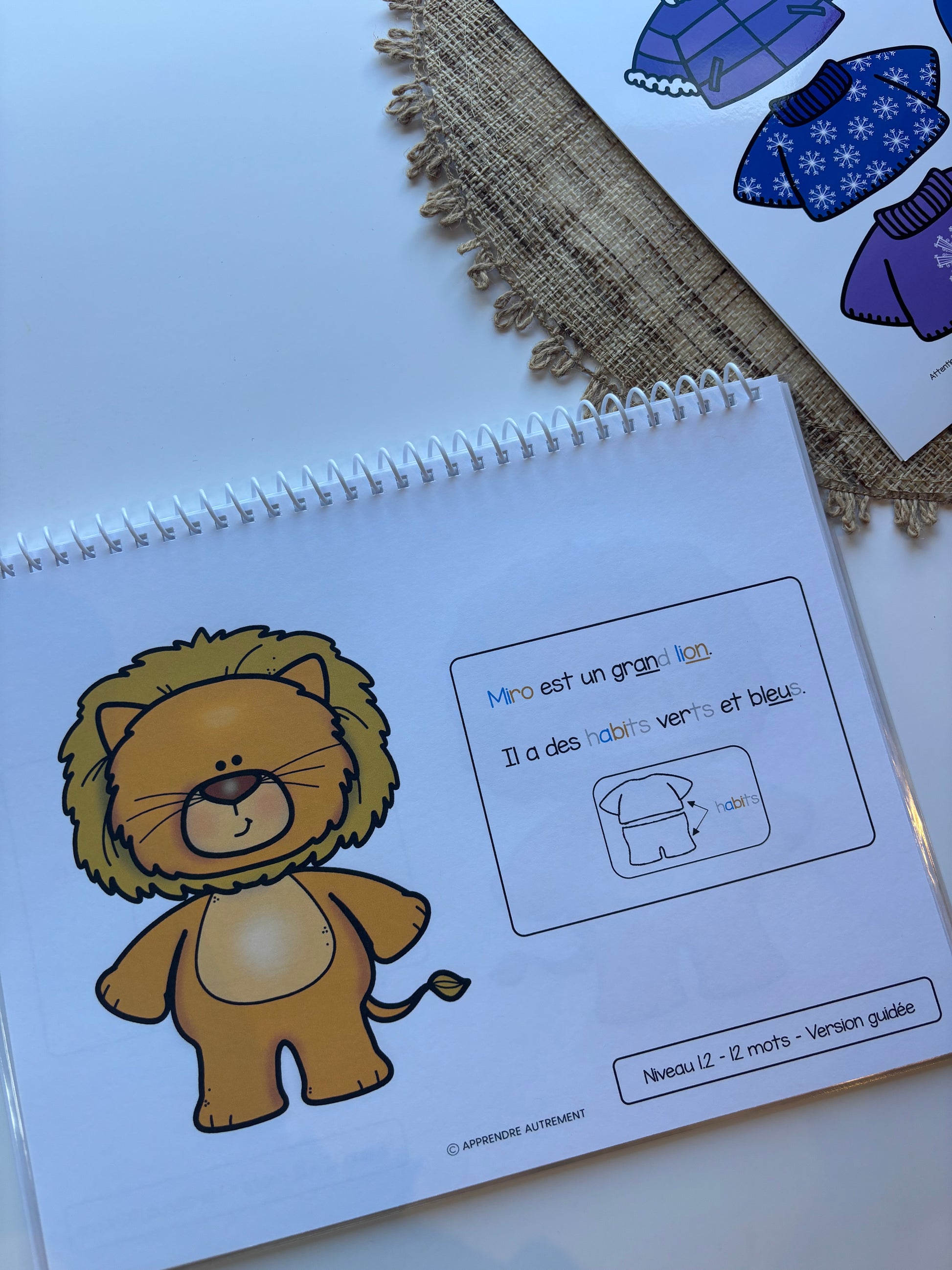 La première activité consolide principalement les sons simples et quelques sons complexes travaillés durant la premier cycle, tout en mettant l’emphase sur les mots dont la maitrise est attendue à la fin de la deuxième année. L’enfant doit lire le texte pour habiller l’animal selon les indices, renforçant ainsi son habileté à associer des informations textuelles à des éléments visuels.
