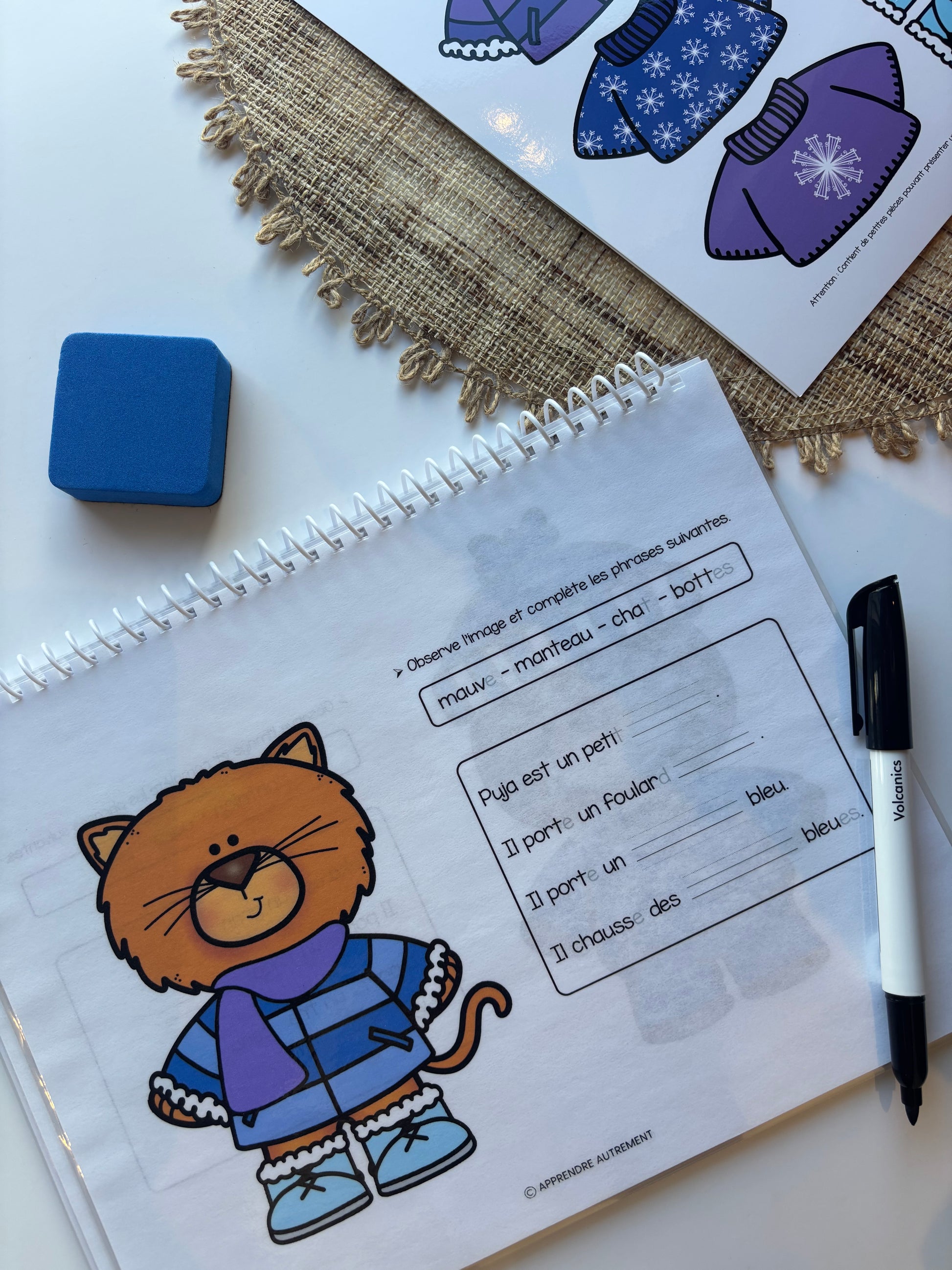 Contient : Un crayon effaçable, une efface, une règle de lecture, 23 morceaux de vêtements pour habiller les animaux et une pochette pour organiser le matériel plastifié.
