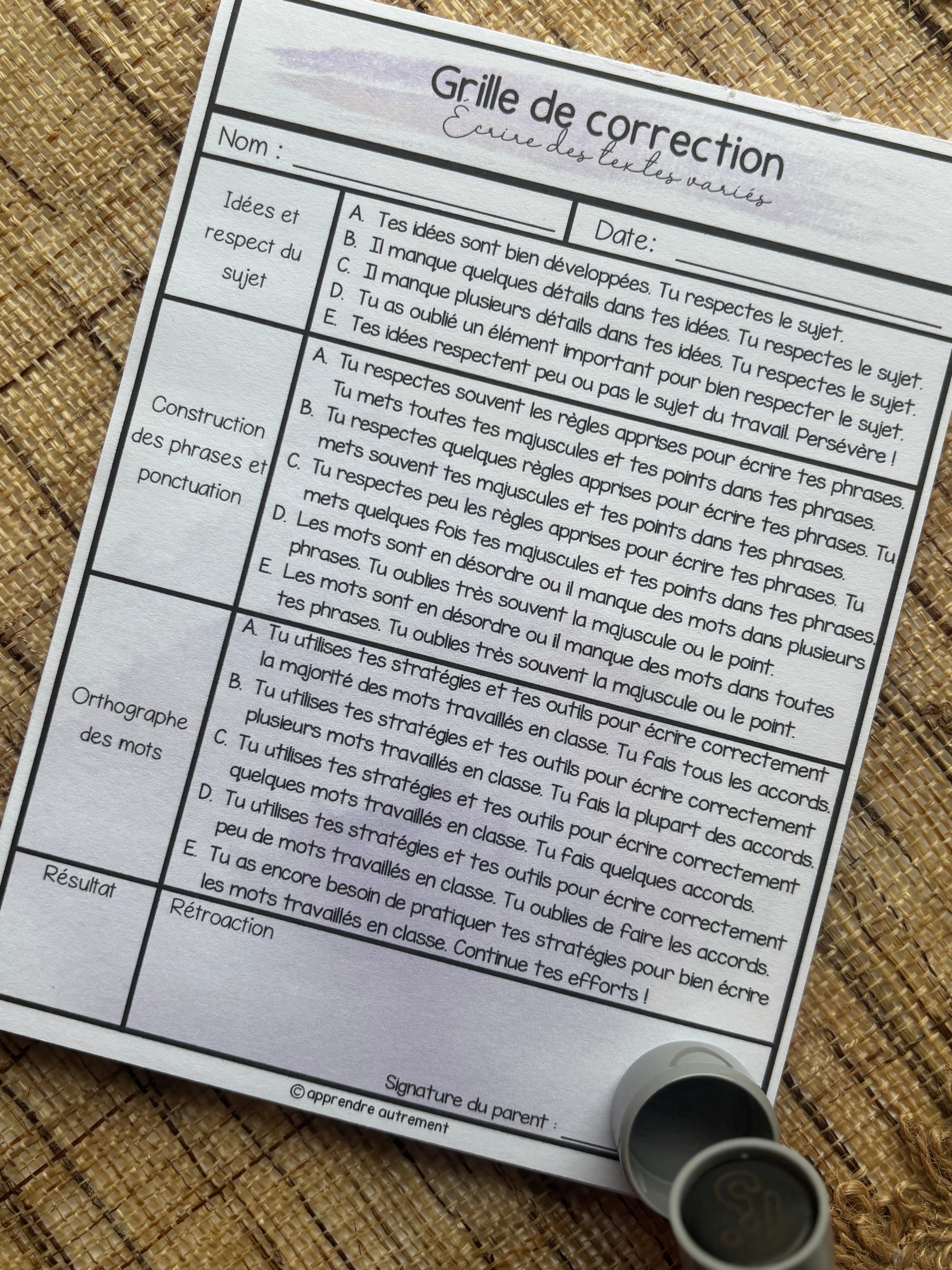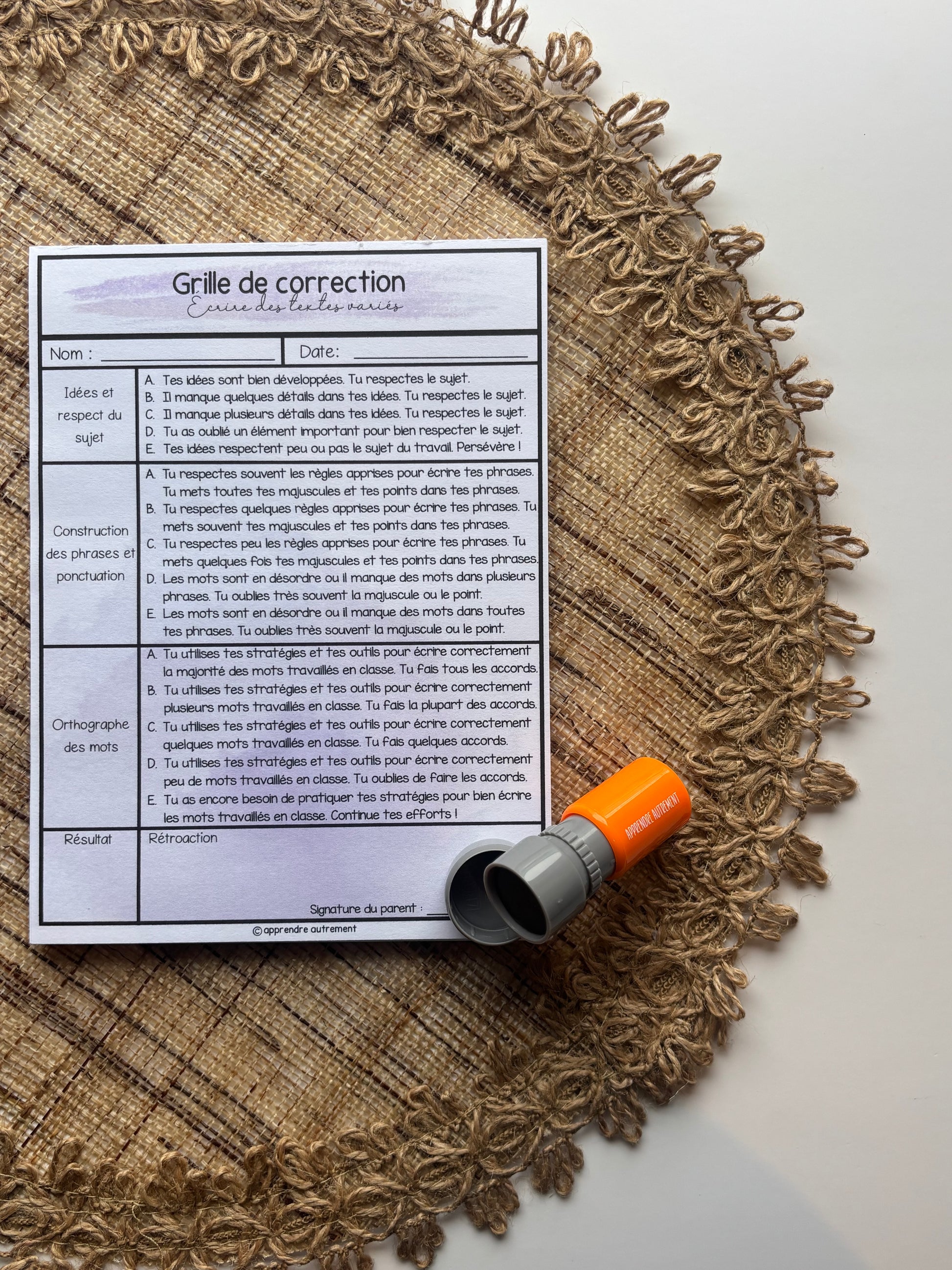 Ce bloc-notes de 50 pages, fait à la main, propose une grille de correction en écriture pour le 1er cycle. Parfait pour corriger les évaluations, faire le suivi avec les parents et soutenir les rétroactions auprès des élèves.